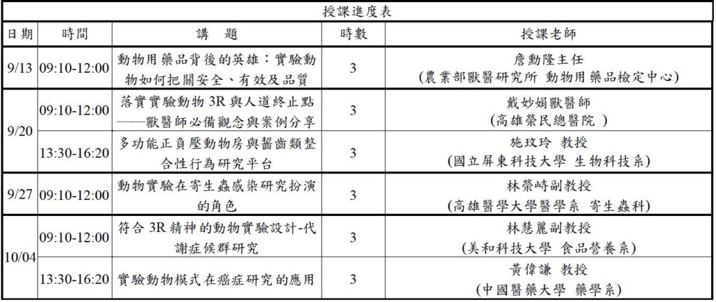 「日常生活與實驗動物科學」藉由簡單易懂且貼近生活的主題,讓不同專業領域的學員了解實驗動物在日常生活中的廣泛應用,以及實驗動物福祉的重要性,透過新科技的應用,作為實驗動物的替代方案,保障實驗動物福祉。