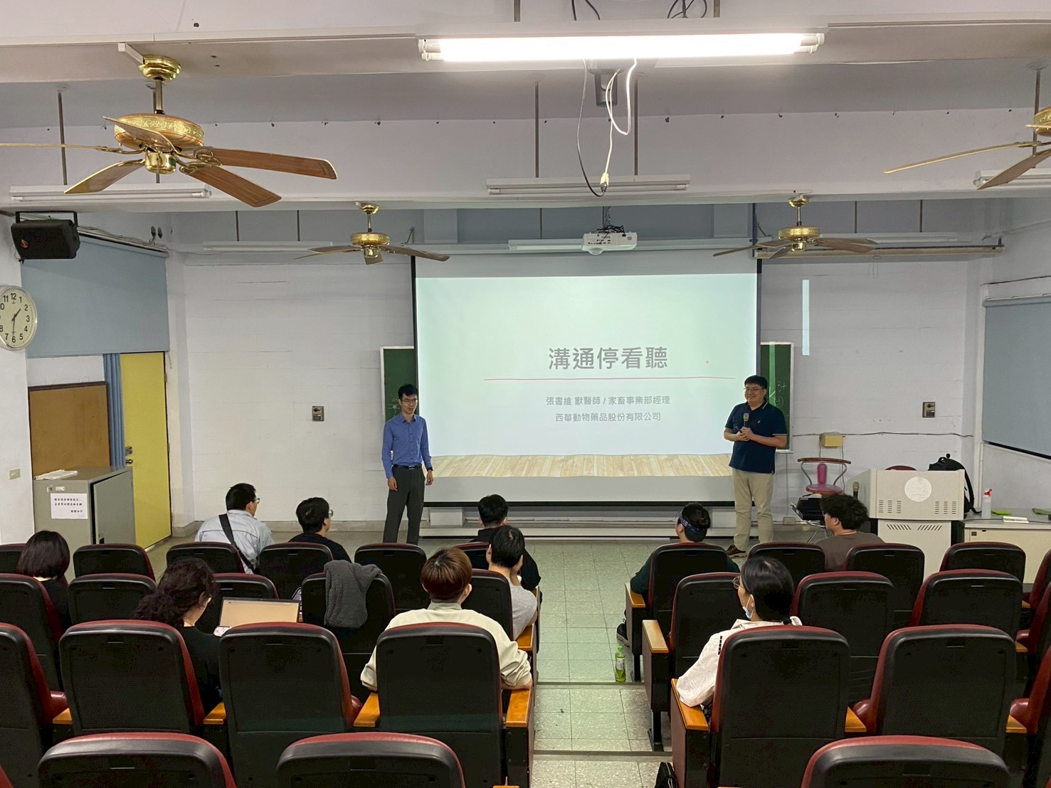 張書維經理於「溝通停看聽」,內容著重於說話禮節、現場互動細節與應避免的溝通方式。透過提問與討論帶領學生思考不同溝通結果背後的原因。提到在說話前先聆聽,且思考彙整腦中想法;當面對提問時以問題回答問題。課堂氣氛輕鬆,但資訊詳細且龐大;獸醫不僅要不斷學習新知識,也要學習人與人的相處。「停看聽」的概念強調觀察現場、先聆聽理解對方狀態後再進行對話,使交流更順暢。